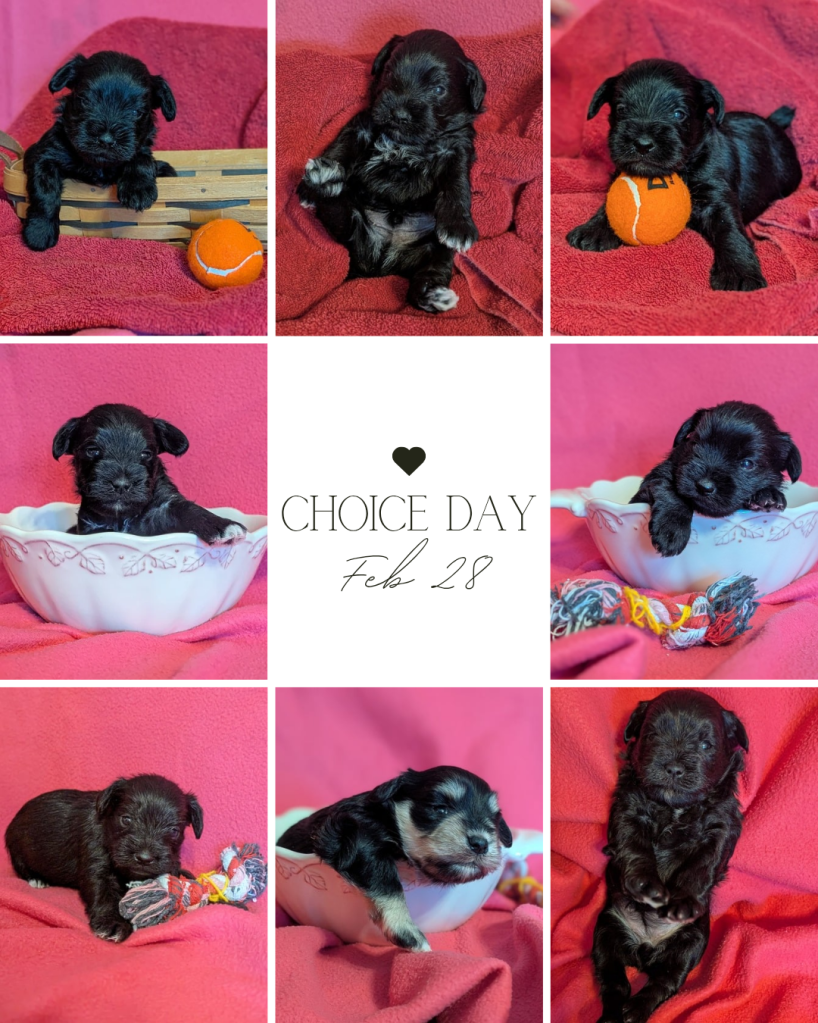 Miniature Schnauzers – Piper and Chip had a litter on New Years Eve! 4 males, 2 females. Choice date is on Valentine’s Day, February 14. There is still limited space to pick a puppy from this litter. They can go home between the 25th and 28th.
